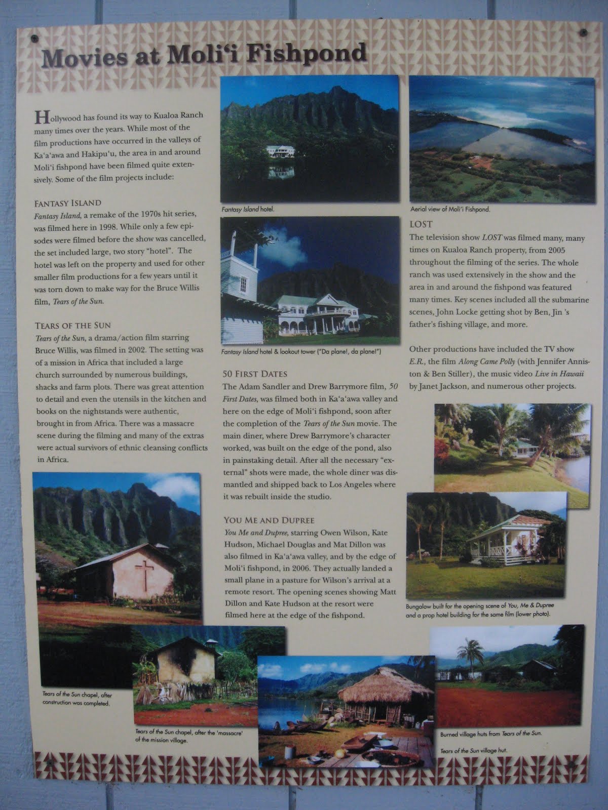 Our next stop was an ancient, man-made fish pond. We rode a catamaran on it and were given a brief history on it's origins. Tony was severely disappointed in it as the water was too murky to see the numerous large fish said to be populating that pond. We got done with the ride and Aria wasn't impressed either. "That was boring!" she commented (too slow a boat ride for her liking, apparently!). In that area, however, quite a few movie and TV shows had been shot. There was a small shack the was the restaurant Drew Barrymore's character worked at in 50 First Dates. Tears of the Sun was shot in that area. The wedding scene from You, Me, and Dupree was shot in a gazebo there. Must of Lost was filmed there, as is a new show call Off the Map. I liked that part of the tour. It's fun to see a scene in a movie and then actually see the area it was shot in. -And it's as beautiful in person as on screen!-